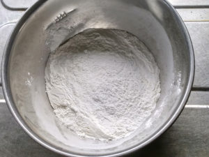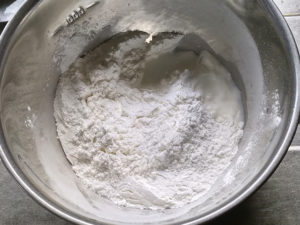 ①ボールに白玉粉、上新粉、砂糖を入れて混ぜ合わせます。