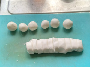 ④生地を16等分し、それぞれ同じくらいの大きさの団子になるようにまとめます。