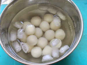 ⑥ゆでた団子は、すぐに氷水の入ったボールに入れ、しっかりと冷やします。