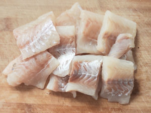 ![]() ①タラのフィレは食べやすい大きさに切ります。 (今回は処理済みのタイプを買ったので、切るだけでOKでした。) |