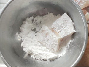 ![]() ②タラのフィレに片栗粉を全面にまぶしましょう。 |
