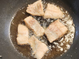 タラは揚げ焼きしますが、周りが固まらないうちに取り出すと、身が崩れる原因になるので、ある程度固くなってから取り出してください。