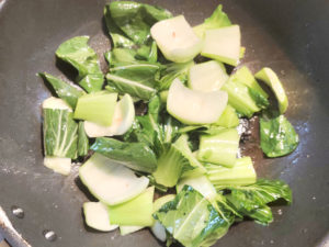 ![]() ⑥タラをフライパンから取り出し、油を大1ほど残して、その油で1~2分ほどチンゲン菜をさっと炒めます。 |