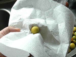 ③小梅の水分を1個ずつ、キッチンペーパーで拭き取ります。