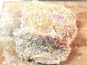 ![]() ②豚肉に、薄力粉→溶き卵→パン粉の順に衣をつけましょう。 |