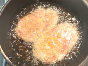 ![]() ③180度の油で、表面がきつね色になるまで揚げます。 (裏表で、3分ずつくらいが目安です。) |