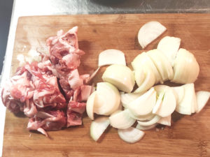 ![]() ④豚こまは食べやすい大きさに、玉ねぎは皮をむいて薄めのくし形に切りましょう。 |