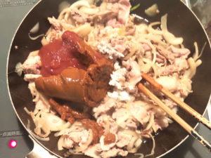![]() ⑤フライパンに薄く油(分量外)を引き、玉ねぎと豚肉を炒め、玉ねぎが半透明になればOK。 ⑥砂糖、ウスターソース、ケチャップ、ドミグラスソース缶の中身を開けて、調味料を溶かします。 |