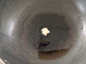 ![]() ①フライパンに油を引き、にんにくを加えて、弱火で炒めて香りを出します。 |