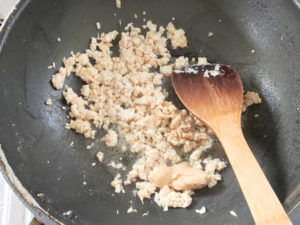 ひき肉は木べらなどを使い、崩しながら炒めるとぽろぽろになります。