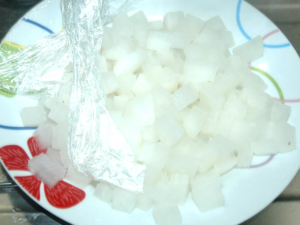 ![]() ①大根は皮をむき、小さい角切りにします。 ②大根を耐熱容器に乗せてラップをし、レンジで6~8分加熱しましょう。 |
