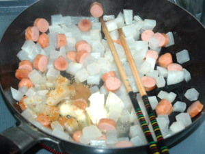 ![]() ③フライパンに薄く油(分量外)を引き、大根とソーセージを炒めます。 ④ソーセージに火が通ればOKです。 ⑤フライパンに白ワイン、にんにく、マーガリン、コンソメを加えて全体を良く混ぜましょう。 ⑥強火で1分程炒め、味が絡めばOK。 |