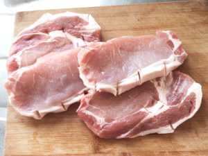 ①豚肉は、身と脂身の間に垂直に切り込みを入れます。