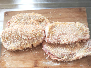 とんかつの衣をつける時には、ぎゅっぎゅっと押すようにして、しっかり目に衣をつけてください。