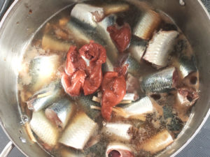 ![]() ⑤鰯を並べいれ、生姜と梅干を加えます。 ⑥その上から、煎茶をひたひたに注ぎいれ、中火にかけましょう。 |