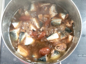 ![]() ⑧10分経ったら、少し火を強め、さらに10分ほど煮ましょう。 (鰯に煮汁をすくいかけながら、照りよく煮て下さい。 ) |