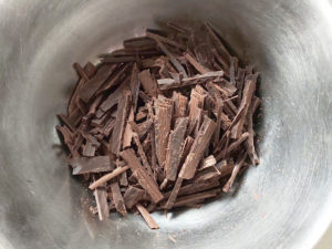 ![]() 1:チョコは細かく均一に刻み、ボールに入れておきます。 |