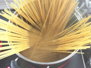 ![]() 1:鍋にたっぷりのお湯を沸かし、パスタをパッケージの時間通りにゆでます。 |