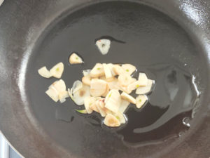 ![]() 2:にんにくは皮をむいて薄切りにします。 3:フライパンにオリーブオイルを引き、にんにくを弱火で炒めて、香りを出しましょう。 |