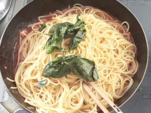 バジルの葉は最後に入れた方が火の通り過ぎを防げます。