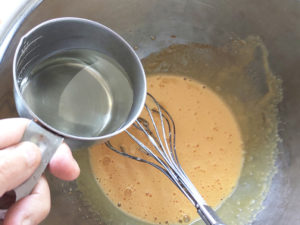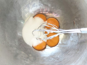 ![]() 4:卵黄のボールに砂糖を加えて泡立て、白っぽくとろりとするまで泡だてます。 |