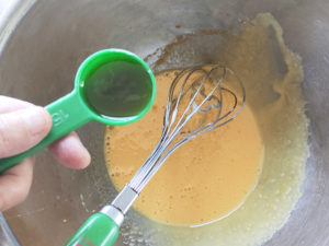 ![]() 6:サラダ油を少しずつ加え、その都度良く混ぜます。 |