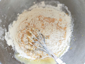 ![]() 7:ドライレーズンに薄力粉大1/2(分量外)をまぶしてから、生地に加えましょう。 8:同時に薄力粉とベーキングパウダーを振り入れて、粉っぽさが消えるまで混ぜます。 |
