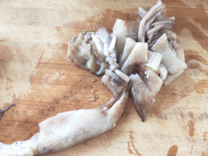 ![]() 3:イカは内臓と骨を取り除き、食べやすい大きさの輪切りにし、目玉も取り除いて足も使います。 |