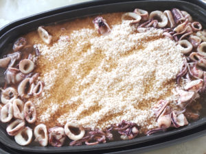![]() 6:ホットプレートのイカを脇によけて、中央に米を平らにならしていれ、調味液をまんべんなくいきわたらせましょう。 |