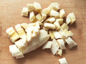 ![]() 5:バナナは皮をむき、ちょっと小さ目の角切りにします。 (バナナは変色を防ぐため、混ぜるギリギリにカットします。) |