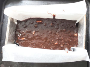 ![]() 7:パウンドケーキ型にオーブンシートを敷き、生地をゴムベラですくい入れたら、平らにならします。 |