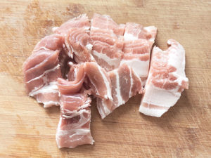 ![]() 1:豚バラ肉は、食べやすい長さにカットします。 |