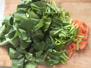![]() 2:ほうれん草は根元を落として5cm幅に切り、人参は皮をむいて細切りにしましょう。 |