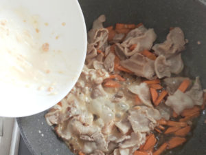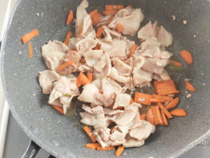 ![]() 3:フライパンに薄く油(分量外)を引き、豚肉と人参を炒めます。 4:肉に完全に火が通り、白くなるまで2~3分炒めましょう。 |