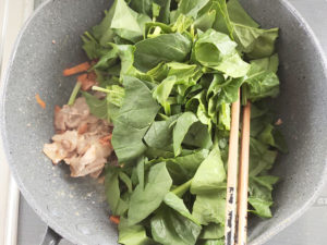 ![]() 7:ほうれん草もフライパンに加え、強火で30秒ほど炒め、ほうれん草がしんなりすればOK。 |