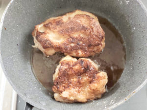 ![]() 9:フライパンに少し多めにサラダ油(分量外)を引き、まず鶏肉の両面に焼き色をつけます。 (裏表2分ずつほど) |