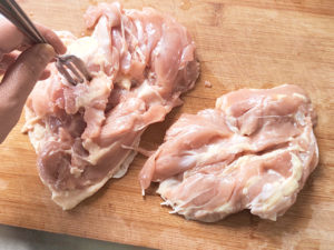 ![]() 3:鶏肉の両面にフォークで数か所穴をあけ、味が染みやすくします。 |