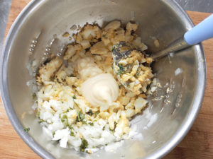 ![]() 6:ボールに玉ねぎとパセリを入れ、寿司酢を混ぜて玉ねぎの辛みを消してから、ゆで卵の半量を入れてマッシャーなどでつぶします。 7:卵が崩れたら、マヨネーズを入れて混ぜてタルタルソースの完成。 |
