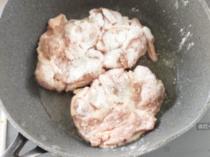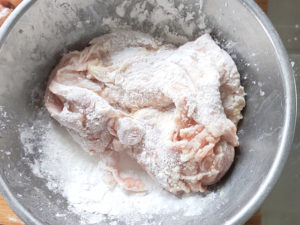 ![]() 8:鶏肉の水気を軽く切ったら、片栗粉を全面にまぶしましょう。 |