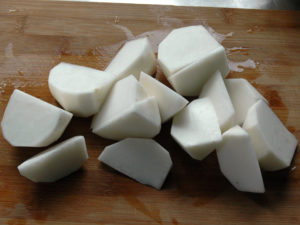 1:カブは皮をむき、4つに割ります。