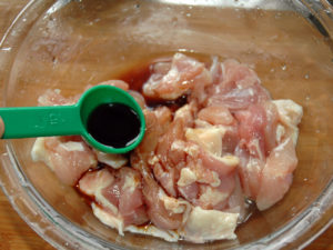 3:鶏肉に、醤油大1とみりん大1(共に分量外)を加えて、揉みこんでおきます。