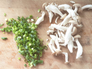 ![]() 1:しめじは根元を落として小房に分け、ねぎは小口切りにします。 |