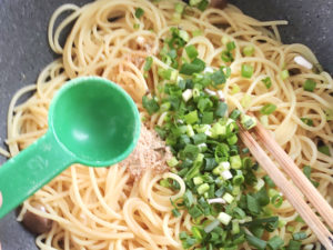 ![]() 6:フライパンにパスタとネギ、響王、めんつゆ、塩を加えて、全体になじむように混ぜます。 7:1分弱、炒めたらOK。 |
