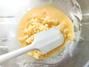 3:マーガリンの粗熱が取れてから、砂糖と卵1/2個(30~32g)を加えてしっかりと混ぜ、泡立て器で持ち上げるととろーっと落ちるまで混ぜます。