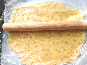 8:台にラップを敷いて生地を乗せ、さらに上にラップを敷いて、麺棒で7mm厚さ×20cmくらいの長方形になるように伸ばします。