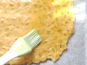 9:天板にオーブンシートを敷き、上に生地を乗せたら、卵の残りを溶いたものを表面にたっぷりと刷毛で塗りましょう。