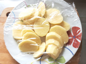 ![]() 1:じゃがいもは皮をむき、8mm厚さにスライスしたら、耐熱皿に乗せます。 2:ラップをして、レンジで5~6分加熱しましょう。 |