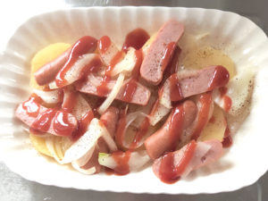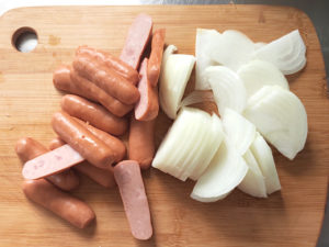 ![]() 3:玉ねぎは皮をむいて薄切りに、ソーセージは縦半分に切ります。 |