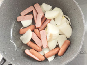 ![]() 5:フライパンにソーセージと玉ねぎを加え、中火で玉ねぎがしんなりするまで火を通します。 |