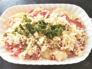 ![]() 6:グラタン皿に、じゃがいもの半量、玉ねぎとソーセージの半量を敷き、上から黒胡椒を3振りします。 |